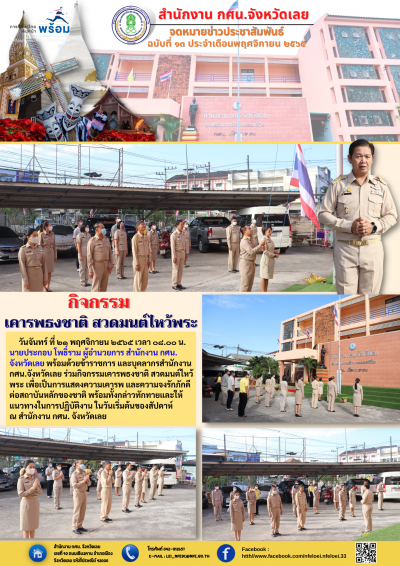 วันจันทร์ ที่ ๒๑ พฤศจิกายน ๒๕๖๕ เวลา ๐๘.๐๐ น. นายประกอบ โพธิ์ราม ผู้อำนวยการ สำนักงาน กศน. จังหวัดเลย พร้อมด้วยข้าราชการ และบุคลากรสำนักงาน กศน.จังหวัดเลย ร่วมกิจกรรมเคารพธงชาติ สวดมนต์ไหว้พระ เพื่อเป็นการแสดงความเคารพ และความจงรักภักดีต่อสถาบันหลักของชาติ พร้อมทั้งกล่าวทักทายและให้แนวทางในการปฏิบัติงาน ในวันเริ่มต้นของสัปดาห์ ณ สำนักงาน กศน. จังหวัดเลย