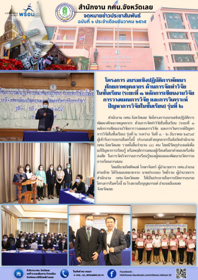 สำนักงาน กศน.จังหวัดเลย จัดโครงการอบรมเชิงปฏิบัติการพัฒนาศักยภาพบุคลากร ด้านการจัดทำวิจัยในชั้นเรียน (ระยะที่ ๑ หลักการเขียนงานวิจัยการวางแผนการวิจัย และการวิเคราะห์ปัญหาการวิจัยในชั้นเรียน) รุ่นที่ ๒ ระหว่าง วันที่ ๑ - ๒ ธันวาคม ๒๕๖๕ ผู้เข้ารับการอบรมในครั้งนี้ ประกอบด้วยบุคลากรในสังกัดสำนักงาน กศน.จังหวัดเลย รวมทั้งสิ้นจำนวน ๘๘ คน โดยมีวัตถุประสงค์เพื่อแก้ปัญหาการเรียนรู้ หรือพฤติกรรมของผู้เรียนค้นหาคำตอบหรือข้อสงสัย ในการจัดกิจกรรมการเรียนรู้ของผู้สอนและพัฒนานวัตกรรมการเรียนการสอน