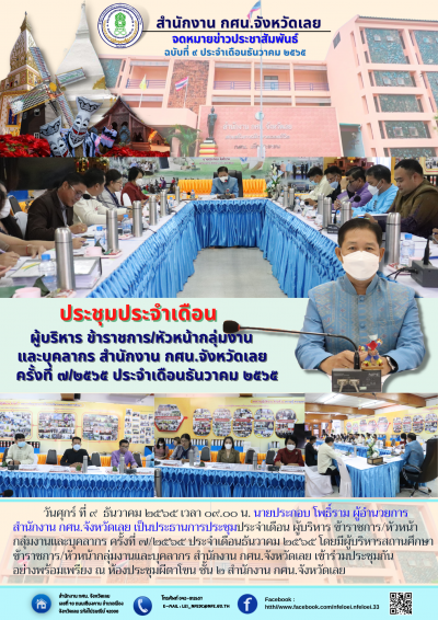 วันศุกร์ ที่ ๙ ธันวาคม ๒๕๖๕ เวลา ๐๙.๐๐ น. นายประกอบ โพธิ์ราม ผู้อำนวยการสำนักงาน กศน.จังหวัดเลย เป็นประธานการประชุมประจำเดือน ผู้บริหาร ข้าราชการ/หัวหน้ากลุ่มงานและบุคลากร ครั้งที่ ๗/๒๕๖๕ ประจำเดือนธันวาคม ๒๕๖๕ โดยมีผู้บริหารสถานศึกษา ข้าราชการ/หัวหน้ากลุ่มงานและบุคลากร สำนักงาน กศน.จังหวัดเลย เข้าร่วมประชุมกัน อย่างพร้อมเพรียง ณ ห้องประชุมผีตาโขน ชั้น ๒ สำนักงาน กศน.จังหวัดเลย
