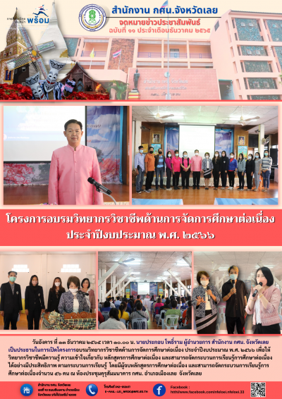 วันอังคาร ที่ ๑๓ ธันวาคม ๒๕๖๕ เวลา ๑๐.๐๐ น. นายประกอบ โพธิ์ราม ผู้อำนวยการ สำนักงาน กศน. จังหวัดเลย เป็นประธานในการเปิดโครงการอบรมวิทยากรวิชาชีพด้านการจัดการศึกษาต่อเนื่อง ประจำปีงบประมาณ พ.ศ. ๒๕๖๖ เพื่อให้วิทยากรวิชาชีพมีความรู้ ความเข้าใจเกี่ยวกับ หลักสูตรการศึกษาต่อเนื่อง และสามารถจัดกระบวนการเรียนรู้การศึกษาต่อเนื่อง ได้อย่างมีประสิทธิภาพ ตามกระบวนการเรียนรู้ โดยมีผู้จบหลักสูตรการศึกษาต่อเนื่อง และสามารถจัดกระบวนการเรียนรู้การศึกษาต่อเนื่องจำนวน ๕๖ คน ณ ห้องประชุมคุรุสัมมนาคาร กศน. อำเภอเมืองเลย จังหวัดเลย