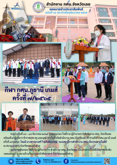 ระหว่างวันที่ ๑๖ - ๑๘ ธันวาคม ๒๕๖๕ นายประกอบ โพธิ์ราม ผู้อำนวยการ สำนักงาน กศน. จังหวัดเลย พร้อมด้วย ผู้บริหาร ข้าราชการ ครู และบุคลากร ในสังกัดสำนักงาน กศน.จังหวัดเลย เข้าร่วมกีฬา กศน.ภูธานี เกมส์ ครั้งที่ ๗/๒๕๖๕ โดยมี นางสาวทรงศรี วิระรังษิยากรณ์ รองเลขาธิการสำนักงาน กศน.เป็นประธานในพิธี ณ สนามนเรศวร จังหวัดหนองบัวลำภู
