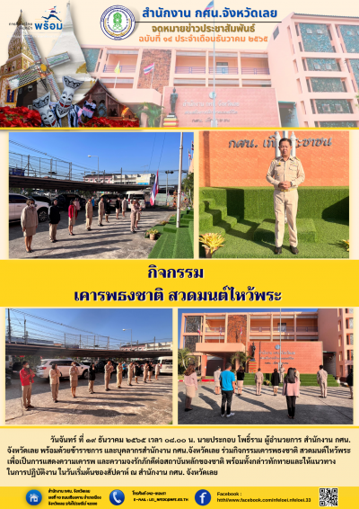 วันจันทร์ ที่ ๑๙ ธันวาคม ๒๕๖๕ เวลา ๐๘.๐๐ น. นายประกอบ โพธิ์ราม ผู้อำนวยการ สำนักงาน กศน. จังหวัดเลย พร้อมด้วยข้าราชการ และบุคลากรสำนักงาน กศน.จังหวัดเลย ร่วมกิจกรรมเคารพธงชาติ สวดมนต์ไหว้พระ เพื่อเป็นการแสดงความเคารพ และความจงรักภักดีต่อสถาบันหลักของชาติ พร้อมทั้งกล่าวทักทายและให้แนวทางในการปฏิบัติงาน ในวันเริ่มต้นของสัปดาห์ ณ สำนักงาน กศน. จังหวัดเลย