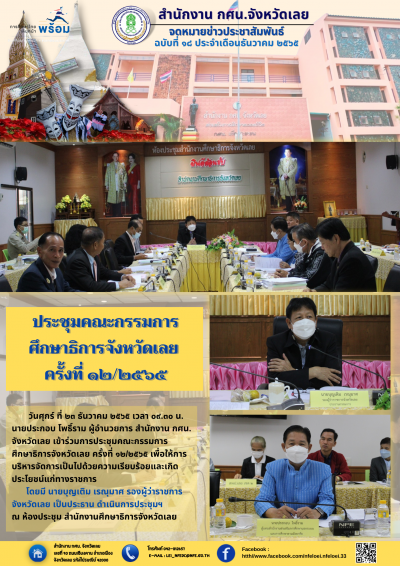 วันศุกร์ ที่ ๒๓ ธันวาคม ๒๕๖๕ เวลา ๐๙.๓๐ น. นายประกอบ โพธิ์ราม ผู้อำนวยการ สำนักงาน กศน. จังหวัดเลย เข้าร่วมการประชุมคณะกรรมการศึกษาธิการจังหวัดเลย ครั้งที่ ๑๒/๒๕๖๕ เพื่อให้การบริหารจัดการเป็นไปด้วยความเรียบร้อยและเกิดประโยชน์แก่ทางราชการ โดยมี นายบุญเติม เรณุมาศ รองผู้ว่าราชการจังหวัดเลย เป็นประธาน ดำเนินการประชุมฯ ณ ห้องประชุม สำนักงานศึกษาธิการจังหวัดเลย