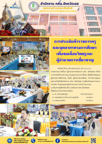 วันจันทร์ ที่ ๒๖ ธันวาคม ๒๕๖๕ เวลา ๐๙.๐๐ น. นายประกอบ โพธิ์ราม ผู้อำนวยการสำนักงาน กศน. จังหวัดเลย เข้ารับ การประเมินข้าราชการครู และบุคลากรทางการศึกษา เพื่อเลื่อนวิทยฐานะ ผู้อำนวยการเชี่ยวชาญ โดยมี ผู้บริหารสถานศึกษา ข้าราชการครูและบุคลากรในสังกัดสำนักงาน กศน. จังหวัดเลย ร่วมต้อนรับคณะกรรมการประเมินฯ ในรูปแบบออนไลน์ ผ่านระบบ ZOOM Meeting ณ ห้องประชุมผีตาโขน ชั้น ๒ สำนักงาน กศน.จังหวัดเลย ซึ่งมีคณะกรรมการประกอบด้วย