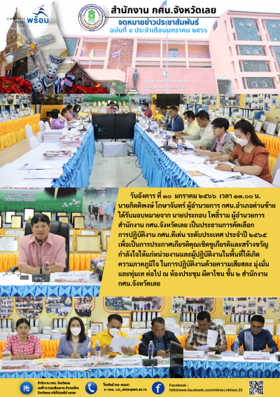 วันอังคาร ที่ ๑๐ มกราคม ๒๕๖๖ เวลา ๑๓.๐๐ น. นายกิตติพงษ์ โกษาจันทร์ ผู้อำนวยการ กศน.อำเภอด่านซ้าย ได้รับมอบหมายจาก นายประกอบ โพธิ์ราม ผู้อำนวยการสำนักงาน กศน.จังหวัดเลย เป็นประธานการคัดเลือกการปฏิบัติงาน กศน.ดีเด่น ระดับประเทศ ประจำปี ๒๕๖๕ เพื่อเป็นการประกาศเกียรติคุณเชิดชูเกียรติและสร้างขวัญกำลังใจให้แก่หน่วยงานและผู้ปฏิบัติงานในพื้นที่ให้เกิดความภาคภูมิใจ ในการปฏิบัติงานด้วยความเสียสละ มุ่งมั่น และทุ่มเท ต่อไป ณ ห้องประชุม ผีตาโขน ชั้น ๒ สำนักงาน กศน.จังหวัดเลย