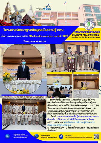 ระหว่างวันที่ ๓๐ มกราคม - ๑ กุมภาพันธ์ ๒๕๖๖ สำนักงาน กศน.จังหวัดเลย จัดโครงการพัฒนาฐานข้อมูลคลังความรู้ กศน. เพื่อการพัฒนาคุณภาพชีวิต (Thailand knowledge portal : TKP) ปีงบประมาณ ๒๕๖๖ เพื่อพัฒนาบุคลากรของ สำนักงาน กศน.