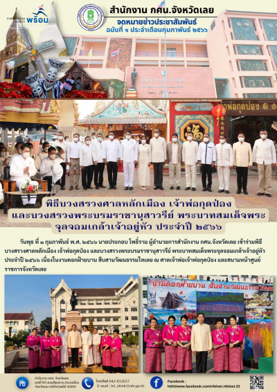 วันพุธ ที่ ๑ กุมภาพันธ์ พ.ศ. ๒๕๖๖ นายประกอบ โพธิ์ราม ผู้อำนวยการสำนักงาน กศน.จังหวัดเลย เข้าร่วมพิธีบวงสรวงศาลหลักเมือง เจ้าพ่อกุดป่อง และบวงสรวงพระบรมราชานุสาวรีย์ พระบาทสมเด็จพระจุลจอมเกล้าเจ้าอยู่หัว ประจำปี ๒๕๖๖ เนื่องในงานดอกฝ้ายบาน สืบสานวัฒนธรรมไทเลย ณ ศาลเจ้าพ่อเจ้าพ่อกุดป่อง และสนามหน้าศูนย์ราชการจังหวัดเลย