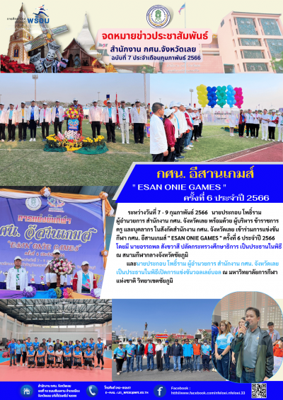 ระหว่างวันที่ 7 - 9 กุมภาพันธ์ 2566 นายประกอบ โพธิ์ราม ผู้อำนวยการ สำนักงาน กศน. จังหวัดเลย พร้อมด้วย ผู้บริหาร ข้าราชการ ครู และบุคลากร ในสังกัดสำนักงาน กศน. จังหวัดเลย เข้าร่วมการแข่งขันกีฬา กศน. อีสานเกมส์ " ESAN ONIE GAMES " ครั้งที่ 6 ประจำปี 2566 โดยมี นายอรรถพล สังขวาสี ปลัดกระทรวงศึกษาธิการ เป็นประธานในพิธี ณ สนามกีฬากลางจังหวัดชัยภูมิ