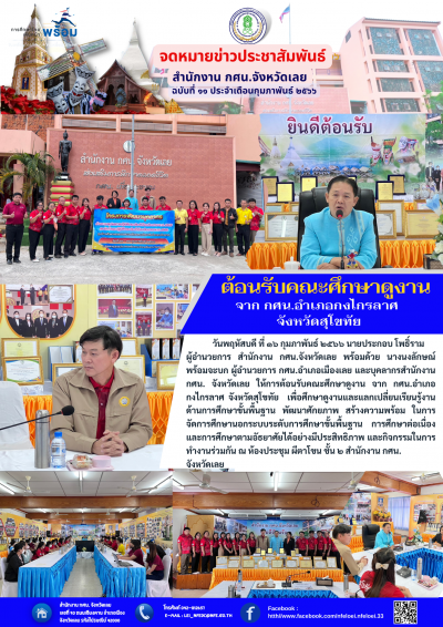 วันพฤหัสบดี ที่ ๑๖ กุมภาพันธ์ ๒๕๖๖ นายประกอบ โพธิ์ราม ผู้อำนวยการ สำนักงาน กศน.จังหวัดเลย พร้อมด้วย นางนงลักษณ์ พร้อมจะบก ผู้อำนวยการ กศน.อำเภอเมืองเลย และบุคลากรสำนักงาน กศน. จังหวัดเลย ให้การต้อนรับคณะศึกษาดูงาน จาก กศน.อำเภอกงไกรลาศ จังหวัดสุโขทัย เพื่อศึกษาดูงานและแลกเปลี่ยนเรียนรู้งานด้านการศึกษาขั้นพื้นฐาน พัฒนาศักยภาพ สร้างความพร้อม ในการจัดการศึกษานอกระบบระดับการศึกษาขั้นพื้นฐาน การศึกษาต่อเนื่อง และการศึกษาตามอัธยาศัยได้อย่างมีประสิทธิภาพ และกิจกรรมในการทำงานร่วมกัน ณ ห้องประชุม ผีตาโขน ชั้น ๒ สำนักงาน กศน. จังหวัดเลย