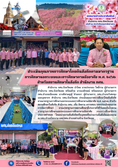 สำนักงาน กศน.จังหวัดเลย นำโดย นายประกอบ โพธิ์ราม ผู้อำนวยการสำนักงาน กศน.จังหวัดเลย พร้อมด้วย นางนงลักษณ์ พร้อมจะบก ผู้อำนวยการ กศน.อำเภอเมืองเลย นางพิชามญชุ์ ลำมะนา ผู้อำนวยการ กศน.อำเภอวังสะพุง และบุคลากร สำนักงาน กศน.จังหวัดเลย ประเมินคุณภาพการศึกษาโดยต้นสังกัดตามมาตรฐานการศึกษานอกระบบและการศึกษาตามอัธยาศัย พ.ศ. ๒๕๖๒ สำหรับสถานศึกษาในสังกัด สำนักงาน กศน. เพื่อ ติดตาม ตรวจสอบ และประเมินคุณภาพการจัดการศึกษา ตามมาตรฐานการสถานศึกษาที่ประกาศใช้ไว้และเป็นไปตามมาตรฐานการศึกษานอกระบบและการศึกษาตามอัธยาศัย กระทรวงศึกษาธิการประกาศกำหนด โดยหน่วยงานต้นสังกัดหรือบุคคลที่หน่วยงานต้นสังกัดมอบหมาย ณ กศน.ตำบลโคกงาม และ กศน.อำเภอด่านซ้าย จังหวัดเลย