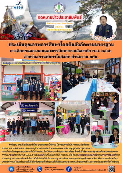 สำนักงาน กศน.จังหวัดเลย นำโดย นายประกอบ โพธิ์ราม ผู้อำนวยการสำนักงาน กศน.จังหวัดเลย พร้อมด้วย นางนงลักษณ์ พร้อมจะบก ผู้อำนวยการ กศน.อำเภอเมืองเลย นางพิชามญชุ์ ลำมะนา ผู้อำนวยการ กศน.อำเภอวังสะพุง และบุคลากร สำนักงาน กศน.จังหวัดเลย ประเมินคุณภาพการศึกษาโดยต้นสังกัดตามมาตรฐานการศึกษานอกระบบและ การศึกษาตามอัธยาศัย พ.ศ. ๒๕๖๒ สำหรับสถานศึกษาในสังกัด สำนักงาน กศน. เพื่อ ติดตาม ตรวจสอบ และประเมินคุณภาพการจัดการศึกษา ตามมาตรฐานการสถานศึกษาที่ประกาศใช้ไว้และเป็นไปตามมาตรฐานการศึกษานอกระบบและการศึกษาตามอัธยาศัย กระทรวงศึกษาธิการประกาศกำหนด โดยหน่วยงานต้นสังกัดหรือบุคคลที่หน่วยงานต้นสังกัดมอบหมาย ณ กศน.ตำบลภูกระดึง และ กศน.อำเภอภูกระดึง จังหวัดเลย