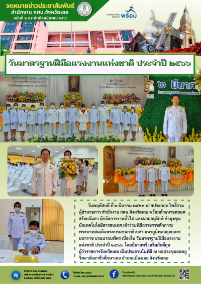 วันพฤหัสบดี ที่ ๒ มีนาคม ๒๕๖๖ นายประกอบ โพธิ์ราม ผู้อำนวยการ สำนักงาน กศน.จังหวัดเลย พร้อมด้วยนายสมยศ สร้อยจันดา นักจัดการงานทั่วไป และนายอนุรักษ์ คำมุงคุณ นักเทคโนโลยีสารสนเทศ เข้าร่วมพิธีถวายราชสักการะ พระบาทสมเด็จพระบรมชนกาธิเบศร มหาภูมิพลอดุลยเดชมหาราช บรมนาถบพิตร เนื่องใน วันมาตรฐานฝีมือแรงงานแห่งชาติ ประจำปี ๒๕๖๖ โดยมีนายทวี เสริมภักดีกุล ผู้ว่าราชการจังหวัดเลย เป็นประธานในพิธี ณ หอประชุมยอดภู วิทยาลัยอาชีวศึกษาเลย อำเภอเมืองเลย จังหวัดเลย