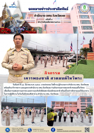 วันจันทร์ ที่ ๑๓ มีนาคม พ.ศ. ๒๕๖๖ นายประกอบ โพธิ์ราม ผู้อำนวยการ สำนักงาน กศน. จังหวัดเลย พร้อมด้วย ข้าราชการ และบุคลากรสำนักงาน กศน.จังหวัดเลย ร่วมกิจกรรมเคารพธงชาติ สวดมนต์ไหว้พระ เพื่อเป็นการแสดงความเคารพ และความจงรักภักดีต่อสถาบันหลักของชาติ พร้อมทั้งกล่าวทักทายและให้แนวทางในการปฏิบัติงาน ในวันเริ่มต้นของสัปดาห์ ณ สำนักงาน กศน. จังหวัดเลย