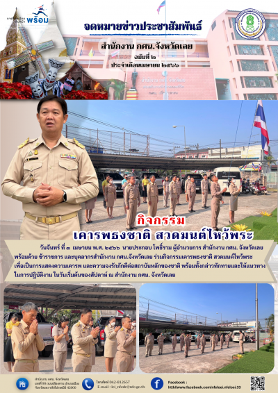 วันจันทร์ ที่ ๓ เมษายน พ.ศ. ๒๕๖๖ นายประกอบ โพธิ์ราม ผู้อำนวยการ สำนักงาน กศน. จังหวัดเลย พร้อมด้วย ข้าราชการ และบุคลากรสำนักงาน กศน.จังหวัดเลย ร่วมกิจกรรมเคารพธงชาติ สวดมนต์ไหว้พระ เพื่อเป็นการแสดงความเคารพ และความจงรักภักดีต่อสถาบันหลักของชาติ พร้อมทั้งกล่าวทักทายและให้แนวทางในการปฏิบัติงาน ในวันเริ่มต้นของสัปดาห์ ณ สำนักงาน กศน. จังหวัดเลย