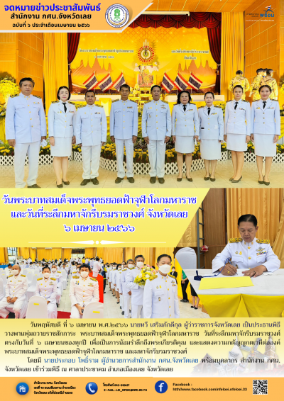 วันพฤหัสบดี ที่ ๖ เมษายน พ.ศ.๒๕๖๖ นายทวี เสริมภักดีกุล ผู้ว่าราชการจังหวัดเลย เป็นประธานพิธี วางพานพุ่มถวายราชสักการะ พระบาทสมเด็จพระพุทธยอดฟ้าจุฬาโลกมหาราช วันที่ระลึกมหาจักรีบรมราชวงศ์ ตรงกับวันที่ ๖ เมษายนของทุกปี เพื่อเป็นการน้อมรำลึกถึงพระเกียรติคุณ และแสดงความกตัญญูกตเวทีต่อองค์ พระบาทสมเด็จพระพุทธยอดฟ้าจุฬาโลกมหาราช และมหาจักรีบรมราชวงศ์ โดยมี นายประกอบ โพธิ์ราม ผู้อำนวยการสำนักงาน กศน.จังหวัดเลย พร้อมบุคลากร สำนักงาน กศน. จังหวัดเลย เข้าร่วมพิธี ณ ศาลาประชาคม อำเภอเมืองเลย จังหวัดเลย
