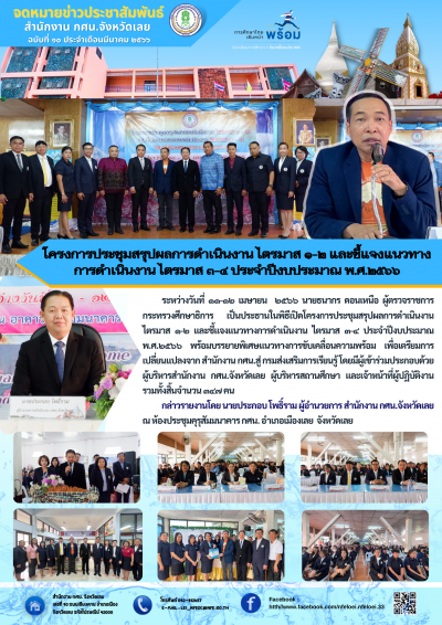 ระหว่างวันที่ ๑๑-๑๒ เมษายน ๒๕๖๖ นายธนากร ดอนเหนือ ผู้ตรวจราชการกระทรวงศึกษาธิการ เป็นประธานในพิธีเปิดโครงการประชุมสรุปผลการดำเนินงาน ไตรมาส ๑-๒ และชี้แจงแนวทางการดำเนินงาน ไตรมาส ๓-๔ ประจำปีงบประมาณ พ.ศ.๒๕๖๖ พร้อมบรรยายพิเศษแนวทางการขับเคลื่อนความพร้อม เพื่อเตรียมการเปลี่ยนแปลงจาก สำนักงาน กศน.สู่ กรมส่งเสริมการเรียนรู้ โดยมีผู้เข้าร่วมประกอบด้วยผู้บริหารสำนักงาน กศน.จังหวัดเลย ผู้บริหารสถานศึกษา และเจ้าหน้าที่ผู้ปฏิบัติงาน รวมทั้งสิ้นจำนวน ๓๔๗ คน กล่าวรายงานโดย นายประกอบ โพธิ์ราม ผู้อำนวยการ สำนักงาน กศน.จังหวัดเลย ณ ห้องประชุมคุรุสัมมนาคาร กศน. อำเภอเมืองเลย จังหวัดเลย