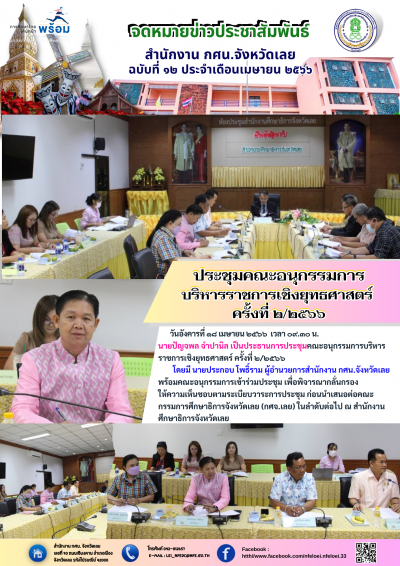 วันอังคารที่ ๑๘ เมษายน ๒๕๖๖ เวลา ๐๙.๓๐ น. นายปัญจพล จำปานิล เป็นประธานการประชุมคณะอนุกรรมการบริหารราชการเชิงยุทธศาสตร์ ครั้งที่ ๒/๒๕๖๖ โดยมี นายประกอบ โพธิ์ราม ผู้อำนวยการสำนักงาน กศน.จังหวัดเลย พร้อมคณะอนุกรรมการเข้าร่วมประชุม เพื่อพิจารณากลั่นกรอง ให้ความเห็นชอบตามระเบียบวาระการประชุม ก่อนนำเสนอต่อคณะกรรมการศึกษาธิการจังหวัดเลย (กศจ.เลย) ในลำดับต่อไป ณ สำนักงานศึกษาธิการจังหวัดเลย