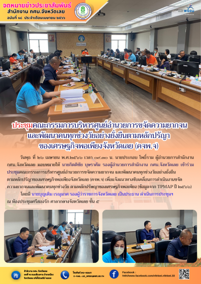 วันพุธ ที่ ๒๖ เมษายน พ.ศ.๒๕๖๖ เวลา ๐๙.๓๐ น. นายประกอบ โพธิ์ราม ผู้อำนวยการสำนักงาน กศน.จังหวัดเลย มอบหมายให้ นายกิตติชัย บุษราคัม รองผู้อำนวยการสำนักงาน กศน.จังหวัดเลย เข้าร่วมประชุมคณะกรรมการบริหารศูนย์อำนวยการขจัดความยากจน และพัฒนาคนทุกช่วงวัยอย่างยั่งยืน ตามหลักปรัญาของเศรษฐกิจพอเพียงจังหวัดเลย (คจพ.จ) เพื่อแจ้งแนวทางขับเคลื่อนการดำเนินงานขจัด ความยากจนและพัฒนาคนทุกช่วงวัย ตามหลักปรัษญาของเศรษฐกิจพอเพียง (ข้อมูลจาก TPMAP ปี ๒๕๖๖) โดยมี นายบุญเติม เรณุมาศ รองผู้ว่าราชการจังหวัดเลย เป็นประธาน ดำเนินการประชุมฯ ณ ห้องประชุมศรีสองรัก ศาลากลางจังหวัดเลย ชั้น ๕