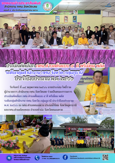 วันจันทร์ ที่ ๑๕ พฤษภาคม ๒๕๖๖ นายประกอบ โพธิ์ราม ผู้อำนวยการ สำนักงาน กศน.จังหวัดเลย ร่วมเป็นคณะกรรมการ ประเมินคัดเลือก กศน.ตำบลต้นแบบ ๕ ดี พรีเมี่ยม พลัส ระดับกลุ่มสำนักงาน กศน.จังหวัด กลุ่มภูธานี ประจำปีงบประมาณ พ.ศ. ๒๕๖๖ ณ กศน.ตำบลหนองแวง อำเภอน้ำโสม จังหวัดอุดรธานี และกศน.ตำบลโคกคอน อำเภอท่าบ่อ จังหวัดหนองคาย