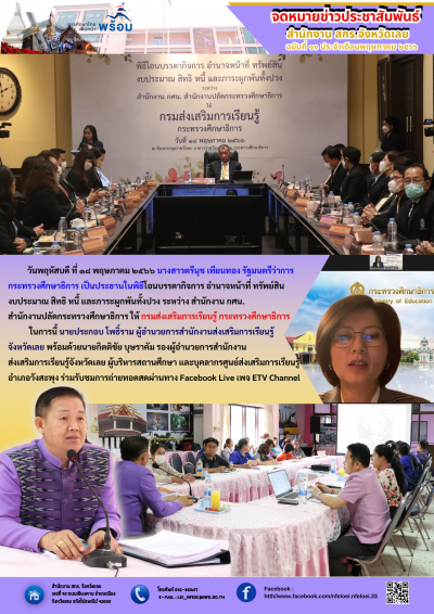 ในการนี้ นายประกอบ โพธิ์ราม ผู้อำนวยการสำนักงานส่งเสริมการเรียนรู้จังหวัดเลย พร้อมด้วยนายกิตติชัย บุษราคัม รองผู้อำนวยการสำนักงานส่งเสริมการเรียนรู้จังหวัดเลย ผู้บริหารสถานศึกษา และบุคลากรศูนย์ส่งเสริมการเรียนรู้อำเภอวังสะพุง ร่วมรับชมการถ่ายทอดสดผ่านทาง Facebook Live เพจ ETV Channel