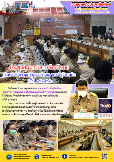 วันอังคาร ที่ ๓๐ พฤษภาคม ๒๕๖๖ นายทวี เสริมภักดีกุล ผู้ว่าราชการจังหวัดเลย เป็นประธานดำเนินการประชุมคณะกรมการ จังหวัดเลย หัวหน้าส่วนราชการ นายอำเภอ ฯลฯ รัฐวิสาหกิจ ครั้งที่ ๔/๒๕๖๖ โดย นายประกอบ โพธิ์ราม ผู้อำนวยการ สำนักงานส่งเสริมการเรียนรู้จังหวัดเลย มอบหมายให้ นายกิตติชัย บุษราคัม รองผู้อำนวยการสำนักงาน ส่งเสริมการเรียนรู้จังหวัดเลย เข้าร่วมประชุมฯ ณ ห้องประชุม ศรีสองรัก ชั้นที่ ๕ ศาลากลางจังหวัดเลย