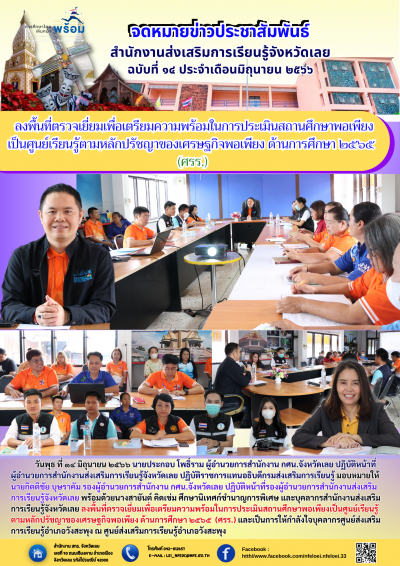 วันพุธ ที่ ๑๔ มิถุนายน ๒๕๖๖ นายประกอบ โพธิ์ราม ผู้อำนวยการสำนักงาน กศน.จังหวัดเลย ปฏิบัติหน้าที่ผู้อำนวยการสำนักงานส่งเสริมการเรียนรู้จังหวัดเลย ปฏิบัติราชการแทนอธิบดีกรมส่งเสริมการเรียนรู้ มอบหมายให้ นายกิตติชัย บุษราคัม รองผู้อำนวยการสำนักงาน กศน.จังหวัดเลย ปฏิบัติหน้าที่รองผู้อำนวยการสำนักงานส่งเสริมการเรียนรู้จังหวัดเลย พร้อมด้วยนางสายันต์ คิดเข่ม ศึกษานิเทศก์ชำนาญการพิเศษ และบุคลากรสำนักงานส่งเสริมการเรียนรู้จังหวัดเลย ลงพื้นที่ตรวจเยี่ยมเพื่อเตรียมความพร้อมในการประเมินสถานศึกษาพอเพียงเป็นศูนย์เรียนรู้ตามหลักปรัชญาของเศรษฐกิจพอเพียง ด้านการศึกษา ๒๕๖๕ (ศรร.) และเป็นการให้กำลังใจบุคลากรศูนย์ส่งเสริมการเรียนรู้อำเภอวังสะพุง ณ ศูนย์ส่งเสริมการเรียนรู้อำเภอวังสะพุง