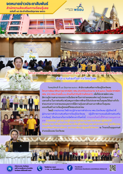 วันพฤหัสบดี ที่ ๑๕ มิถุนายน ๒๕๖๖ สำนักงานส่งเสริมการเรียนรู้จังหวัดเลย โครงการพัฒนาศักยภาพอาสาสมัคร กศน.ประจำปีงบประมาณ พ.ศ.๒๕๖๖ โดยมีอาสาสมัคร กศน. จาก กศน.ตำบลทั้ง ๙๐ ตำบลในกำกับเข้าร่วมโครงการ เพื่อให้อาสาสมัคร กศน.มีความรู้ความสามารถและการเป็นจิตอาสาในการถ่ายทอดองค์ความรู้ ประสบการณ์เฉพาะด้าน ในการส่งเสริม สนับสนุนการจัดการศึกษาให้แก่ประชาชนในชุมชนได้อย่างทั่วถึงช่วยบรรเทาภาวะขาดแคลนบุคลากรที่มีความรู้เฉพาะด้านทางการศึกษาในชุมชนและเสริมสร้างการเรียนรู้ตลอดชีวิตของประชาชน