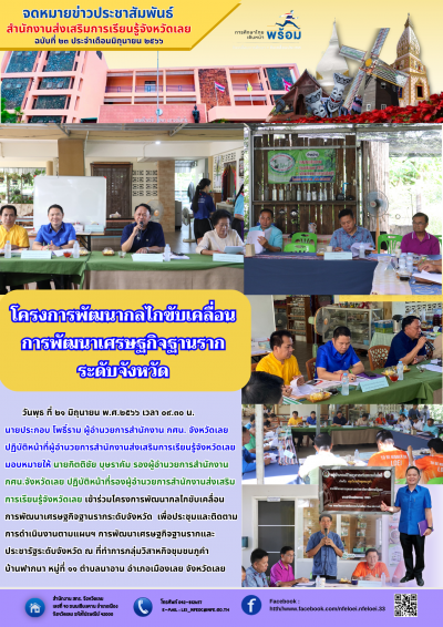 วันพุธ ที่ ๒๑ มิถุนายน พ.ศ.๒๕๖๖ เวลา ๐๙.๓๐ น. นายประกอบ โพธิ์ราม ผู้อำนวยการสำนักงาน กศน. จังหวัดเลย ปฏิบัติหน้าที่ผู้อำนวยการสำนักงานส่งเสริมการเรียนรู้จังหวัดเลย มอบหมายให้ นายกิตติชัย บุษราคัม รองผู้อำนวยการสำนักงาน กศน.จังหวัดเลย ปฏิบัติหน้าที่รองผู้อำนวยการสำนักงานส่งเสริมการเรียนรู้จังหวัดเลย เข้าร่วมโครงการพัฒนากลไกขับเคลื่อนการพัฒนาเศรษฐกิจฐานรากระดับจังหวัด เพื่อประชุมและติดตามการดำเนินงานตามแผนฯ การพัฒนาเศรษฐกิจฐานรากและประชารัฐระดับจังหวัด ณ ที่ทำการกลุ่มวิสาหกิจชุมชนภูคำ บ้านฟากนา หมู่ที่ ๑๑ ตำบลนาอาน อำเภอเมืองเลย จังหวัดเลย