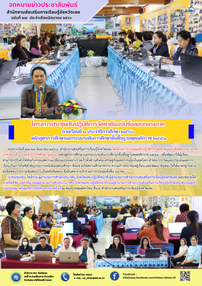 ระหว่างวันที่ ๒๒-๒๓ มิถุนายน ๒๕๖๖ สำนักงานส่งเสริมการเรียนรู้จังหวัดเลย จัดโครงการประชุมเชิงปฏิบัติการจัดทำต้นฉบับข้อสอบกลางภาคภาคเรียนที่ ๑ ประจำปี การศึกษา ๒๕๖๖ หลักสูตรการศึกษานอกระบบระดับการศึกษาขั้นพื้นฐานพุทธศักราช ๒๕๕๑ เพื่อพัฒนาให้ผู้เรียนสามารถปรับตัวให้ทันกับกระแสความเปลี่ยนแปลงอย่างรวดเร็วทั้งด้านสังคม เศรษฐกิจและการเมืองในยุคโลกาภิวัตน์ การวัดและประเมินผลการเรียนเป็นภารกิจที่สำคัญประการหนึ่งของสถนศึกษา ที่จะช่วยให้สถานศึกษาทราบ ความก้าวหน้าของผู้เรียน และพัฒนาข้อสอบให้ได้มาตรฐานตามผังข้อสอบรวบรวมข้อสอบไว้ เป็นคลังข้อสอบ ซึ่งมีบุคลากรเข้าร่วมการประชุมทั้งสิ้น ๖๑ คน