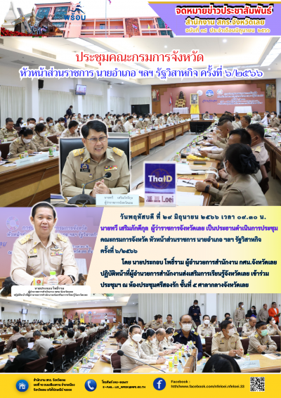 วันพฤหัสบดี ที่ ๒๙ มิถุนายน ๒๕๖๖ เวลา ๐๙.๓๐ น. นายทวี เสริมภักดีกุล ผู้ว่าราชการจังหวัดเลย เป็นประธานดำเนินการประชุมคณะกรมการจังหวัด หัวหน้าส่วนราชการ นายอำเภอ ฯลฯ รัฐวิสาหกิจ ครั้งที่ ๖/๒๕๖๖