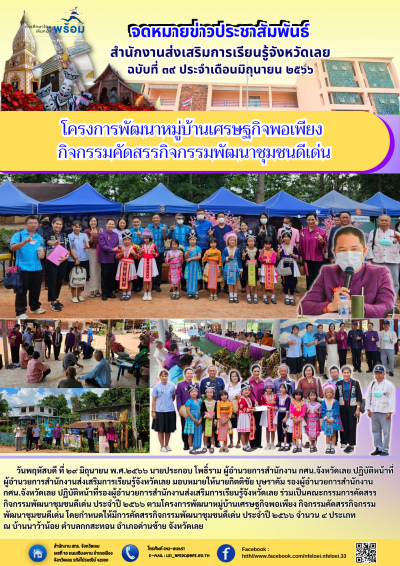 วันพฤหัสบดี ที่ ๒๙ มิถุนายน พ.ศ.๒๕๖๖ นายประกอบ โพธิ์ราม ผู้อำนวยการสำนักงาน กศน.จังหวัดเลย ปฏิบัติหน้าที่ผู้อำนวยการสำนักงานส่งเสริมการเรียนรู้จังหวัดเลย มอบหมายให้นายกิตติชัย บุษราคัม รองผู้อำนวยการสำนักงาน กศน.จังหวัดเลย ปฏิบัติหน้าที่รองผู้อำนวยการสำนักงานส่งเสริมการเรียนรู้จังหวัดเลย ร่วมเป็นคณะกรรมการคัดสรรกิจกรรมพัฒนาชุมชนดีเด่น ประจำปี ๒๕๖๖ ตามโครงการพัฒนาหมู่บ้านเศรษฐกิจพอเพียง กิจกรรมคัดสรรกิจกรรมพัฒนาชุมชนดีเด่น โดยกำหนดให้มีการคัดสรรกิจกรรมพัฒนาชุมชนดีเด่น ประจำปี ๒๕๖๖ จำนวน ๔ ประเภท ณ บ้านนาว้าน้อย ตำบลกกสะทอน อำเภอด่านซ้าย จังหวัดเลย