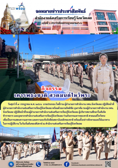 วันศุกร์ ที่ ๗ กรกฎาคม พ.ศ. ๒๕๖๖ นายประกอบ โพธิ์ราม ผู้อำนวยการสำนักงาน กศน.จังหวัดเลย ปฏิบัติหน้าที่ผู้อำนวยการสำนักงานส่งเสริมการเรียนรู้จังหวัดเลย พร้อมด้วยนายกิตติชัย บุษราคัม รองผู้อำนวยการสำนักงาน กศน. จังหวัดเลย ปฏิบัติหน้าที่รองผู้อำนวยการสำนักงานส่งเสริมการเรียนรู้จังหวัดเลย ผู้บริหารสถานศึกษาในสังกัดข้าราชการ และบุคลากรสำนักงานส่งเสริมการเรียนรู้จังหวัดเลย ร่วมกิจกรรมเคารพธงชาติ สวดมนต์ไหว้พระ เพื่อเป็นการแสดงความเคารพ และความจงรักภักดีต่อสถาบันหลักของชาติ พร้อมทั้งกล่าวทักทายและให้แนวทางในการปฏิบัติงาน ในวันเริ่มต้นของสัปดาห์ ณ สำนักงานส่งเสริมการเรียนรู้จังหวัดเลย