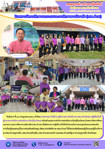 วันอังคาร ที่ ๑๑ กรกฎาคม ๒๕๖๖ นำโดยนายประกอบ โพธิ์ราม ผู้อำนวยการสำนักงาน กศน.จังหวัดเลย ปฏิบัติหน้าที่ผู้อำนวยการสำนักงานส่งเสริมการเรียนรู้จังหวัดเลย พร้อมด้วยบุคลากรสำนักงานส่งเสริมการเรียนรู้จังหวัดเลย นิเทศการจัดการศึกษานอกระบบ และการศึกษาตามอัธยาศัย (กศน.ตำบล) เพื่อติดตามการปฏิบัติงานให้เป็นไปตามนโยบายและจุดเน้นของกรมส่งเสริมการเรียนรู้ตลอดจนเป็นการส่งเสริมสนับสนุน พัฒนาประสิทธิภาพ กศน.ตำบล ให้เกิดประสิทธิผลต่อผู้เรียนและผู้รับบริการ ณ กศน.ตำบลภูกระดึง, กศน.ตำบลห้วยส้ม, กศน.ตำบลผานกเค้า และกศน.ตำบลศรีฐาน อำเภอภูกระดึง จังหวัดเลย