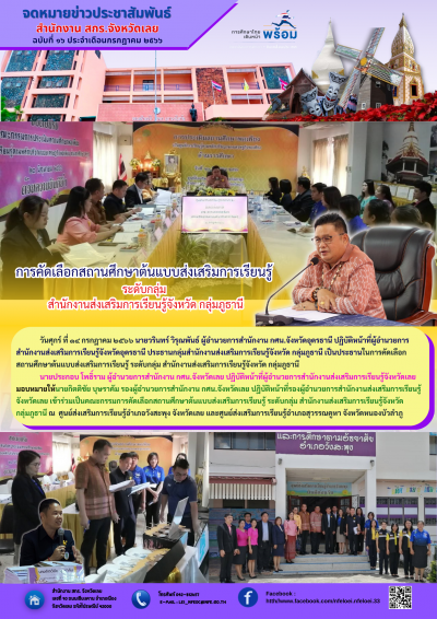 วันศุกร์ ที่ ๑๔ กรกฎาคม ๒๕๖๖ นายวรินทร์ วิรุณพันธ์ ผู้อำนวยการสำนักงาน กศน.จังหวัดอุดรธานี ปฏิบัติหน้าที่ผู้อำนวยการสำนักงานส่งเสริมการเรียนรู้จังหวัดอุดรธานี ประธานกลุ่มสำนักงานส่งเสริมการเรียนรู้จังหวัด กลุ่มภูธานี เป็นประธานในการคัดเลือกสถานศึกษาต้นแบบส่งเสริมการเรียนรู้ ระดับกลุ่ม สำนักงานส่งเสริมการเรียนรู้จังหวัด กลุ่มภูธานี