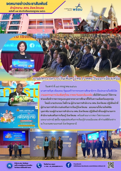 วันเสาร์ ที่ ๑๕ กรกฎาคม ๒๕๖๖ นางสาวตรีนุช เทียนทอง รัฐมนตรีว่าการกระทรวงศึกษาธิการ เป็นประธานในพิธีเปิดงานมหกรรมการเงินเพื่อครูไทย ภาคตะวันออกเฉียงเหนือ เพื่อให้คำแนะนำ ให้ความช่วยเหลือข้าราชการครูและบุคลากรทางการศึกษาที่ได้รับความเดือดร้อนทุกกลุ่ม