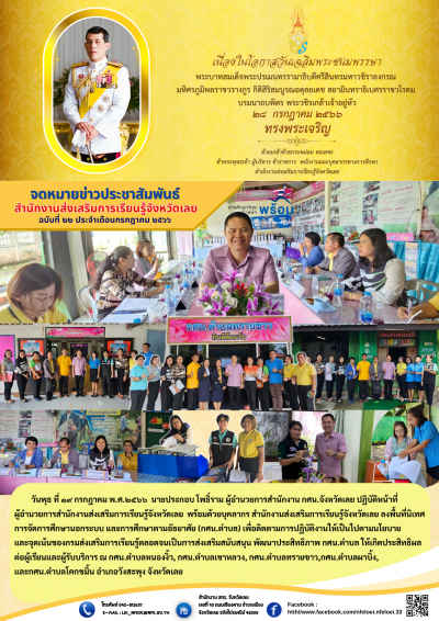 วันพุธ ที่ ๑๙ กรกฎาคม พ.ศ.๒๕๖๖ นายประกอบ โพธิ์ราม ผู้อำนวยการสำนักงาน กศน.จังหวัดเลย ปฏิบัติหน้าที่ผู้อำนวยการสำนักงานส่งเสริมการเรียนรู้จังหวัดเลย มอบหมายให้นายกิตติชัย บุษราคัม รองผู้อำนวยการสำนักงาน กศน. จังหวัดเลย ปฏิบัติหน้าที่รองผู้อำนวยการสำนักงานส่งเสริมการเรียนรู้จังหวัดเลย พร้อมด้วยบุคลากร สำนักงานส่งเสริมการเรียนรู้จังหวัดเลย ลงพื้นที่นิเทศการจัดการศึกษานอกระบบ และการศึกษาตามอัธยาศัย (กศน.ตำบล) เพื่อติดตามการปฏิบัติงานให้เป็นไปตามนโยบายและจุดเน้นของกรมส่งเสริมการเรียนรู้ตลอดจนเป็นการส่งเสริมสนับสนุน พัฒนาประสิทธิภาพ กศน. ตำบล ให้เกิดประสิทธิผลต่อผู้เรียนและผู้รับบริการ ณ กศน.ตำบลหนองงิ้ว, กศน.ตำบลเขาหลวง, กศน.ตำบลทรายขาว, กศน.ตำบลผาบิ้ง,และกศน.ตำบลโคกขมิ้น อำเภอวังสะพุง จังหวัดเลย