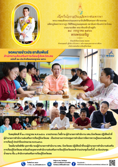 วันพฤหัสบดี ที่ ๒๐ กรกฎาคม พ.ศ.๒๕๖๖ นายประกอบ โพธิ์ราม ผู้อำนวยการสำนักงาน กศน.จังหวัดเลย ปฏิบัติหน้าที่ผู้อำนวยการสำนักงานส่งเสริมการเรียนรู้จังหวัดเลย เป็นประธานการประชุมการดำเนินการจัดการความรู้ของกรมส่งเสริมการเรียนรู้ ประจำปีงบประมาณ พ.ศ.๒๕๖๖