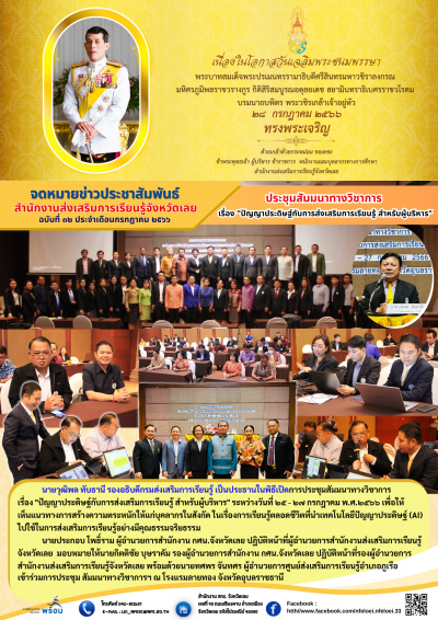 นายวุฒิพล ทับธานี รองอธิบดีกรมส่งเสริมการเรียนรู้ เป็นประธานในพิธีเปิดการประชุมสัมมนาทางวิชาการ เรื่อง "ปัญญาประดิษฐ์กับการส่งเสริมการเรียนรู้ สำหรับผู้บริหาร" ระหว่างวันที่ ๒๕ - ๒๗ กรกฎาคม พ.ศ.๒๕๖๖ เพื่อให้เห็นแนวทางการสร้างความตระหนักให้แก่บุคลากรในสังกัด ในเรื่องการเรียนรู้ตลอดชีวิตที่นำเทคโนโลยีปัญญาประดิษฐ์ (AI) ไปใช้ในการส่งเสริมการเรียนรู้อย่างมีคุณธรรมจริยธรรม