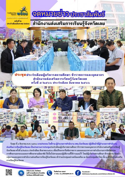 วันพุธ ที่ ๙ สิงหาคม พ.ศ. ๒๕๖๖ นายประกอบ โพธิ์ราม ผู้อำนวยการสำนักงาน กศน.จังหวัดเลย ปฏิบัติหน้าที่ผู้อำนวยการสำนักงานส่งเสริมการเรียนรู้จังหวัดเลย เป็นประธานการประชุมประจำเดือนผู้บริหารสถานศึกษา ข้าราชการและบุคลากร สำนักงานส่งเสริมการเรียนรู้จังหวัดเลย ครั้งที่ ๕/๒๕๖๖ ประจำเดือน สิงหาคม ๒๕๖๖ เพื่อปรึกษาหารือข้อราชการ และมอบแนวทางการดำเนินงานการจัดกิจกรรมการศึกษานอกระบบและการศึกษาตามอัธยาศัย ให้เป็นไปตามแผนปฏิบัติงานที่ได้วางแผนไว้ โดยมีผู้บริหารสถานศึกษา ข้าราชการ/หัวหน้ากลุ่มงานและบุคลากรสำนักงานส่งเสริมการเรียนรู้จังหวัดเลย เข้าร่วมประชุมอย่างพร้อมเพรียง ณ ห้องประชุมผีตาโขน ชั้น ๒ สำนักงานส่งเสริมการเรียนรู้จังหวัดเลย