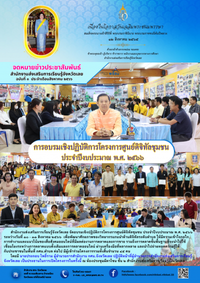 สำนักงานส่งเสริมการเรียนรู้จังหวัดเลย จัดอบรมเชิงปฏิบัติการโครงการศูนย์ดิจิทัลชุมชน ประจำปีงบประมาณ พ.ศ. ๒๕๖๖ ระหว่างวันที่ ๑๐ - ๑๑ สิงหาคม ๒๕๖๖ เพื่อพัฒนาศักยภาพของวิทยากรแกนนำด้านดิจิทัลระดับตำบล ให้มีความเข้าใจกลไก การทำงานและแนวโน้มของสื่อสังคมออนไลน์ที่มีผลต่องานการตลาดและการขาย รวมถึงการตลาดขั้นพื้นฐานที่จะนำไปใช้เชื่อมโยงระหว่างการตลาดแบบดั้งเดิมและการตลาดออนไลน์ ผ่านเครื่องมือที่หลากหลาย และนำไปถ่ายทอดความรู้ให้กับประชาชนในพื้นที่ กศน.ตำบล ต่อไป มีผู้เข้าร่วมโครงการรวมทั้งสิ้นจำนวน ๔๕ คน