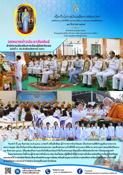 วันเสาร์ ที่ ๑๒ สิงหาคม พ.ศ.๒๕๖๖ นายทวี เสริมภักดีกุล ผู้ว่าราชการจังหวัดเลย เป็นประธานพิธีทำบุญตักบาตรถวายพระราชกุศล เนื่องในโอกาสวันเฉลิมพระชนมพรรษา สมเด็จพระนางเจ้าสิริกิติ์ พระบรมราชินีนาถ พระบรมราชชนนีพันปีหลวง ๑๒ สิงหาคม ๒๕๖๖ เพื่อแสดงถึงความจงรักภักดีและน้อมรำลึกในพระกรุณาธิคุณที่ทรงมีต่อพสกนิกรชาวไทยทุกหมู่เหล่า