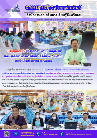 วันพุธ ที่ ๑๖ สิงหาคม พ.ศ. ๒๕๖๖ เวลา ๑๓.๓๐ น. นายประกอบ โพธิ์ราม ผู้อำนวยการสำนักงาน กศน.จังหวัดเลยปฏิบัติหน้าที่ผู้อำนวยการสำนักงานส่งเสริมการเรียนรู้จังหวัดเลย เป็นประธานในการประชุมภายใน ข้าราชการ หัวหน้ากลุ่มงานและบุคลากรทางการศึกษา ครั้งที่ ๗/๒๕๖๖ ประจำเดือนสิงหาคม พ.ศ.๒๕๖๖ โดยมี นายกิตติชัย บุษราคัม รองผู้อำนวยการสำนักงาน กศน.จังหวัดเลย ปฏิบัติหน้าที่รองผู้อำนวยการสำนักงานส่งเสริมการเรียนรู้จังหวัดเลย พร้อมด้วยข้าราชการ/หัวหน้ากลุ่มงาน และบุคลากร สำนักงานส่งเสริมการเรียนรู้จังหวัดเลย เข้าร่วมประชุมกันอย่างพร้อมเพรียง ณ ห้องประชุม ผีตาโขน ชั้น ๒ สำนักงานส่งเสริมการเรียนรู้จังหวัดเลย