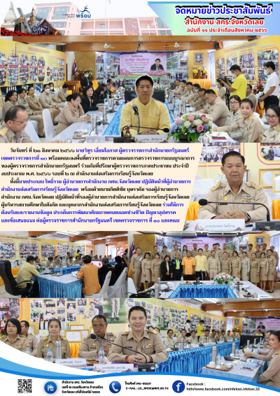 วันจันทร์ ที่ ๒๑ สิงหาคม ๒๕๖๖ นายวิฑูร เอี่ยมโอภาส ผู้ตรวจราชการสำนักนายกรัฐมนตรี เขตตรวจราชการที่ ๑๐ พร้อมคณะลงพื้นที่ตรวจราชการตามแผนการตรวจราชการแบบบูรณาการของผู้ตรวจราชการสำนักนายกรัฐมนตรี ร่วมกับที่ปรึกษาผู้ตรวจราชการภาคประชาชน ประจำปี งบประมาณ พ.ศ. ๒๕๖๖ รอบที่ ๒ ณ สำนักงานส่งเสริมการเรียนรู้จังหวัดเลย