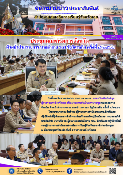 วันที่ ๓๐ สิงหาคม ๒๕๖๖ เวลา ๐๙.๓๐ น. นายทวี เสริมภักดีกุล ผู้ว่าราชการจังหวัดเลย เป็นประธานดำเนินการประชุมคณะกรมการจังหวัด หัวหน้าส่วนราชการ นายอำเภอ ฯลฯ รัฐวิสาหกิจ ครั้งที่ ๘/๒๕๖๖