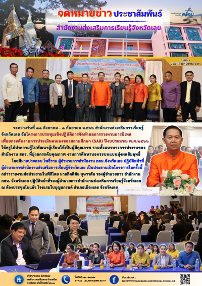 ระหว่างวันที่ ๓๑ สิงหาคม - ๑ กันยายน ๒๕๖๖ สำนักงานส่งเสริมการเรียนรู้จังหวัดเลย จัดโครงการประชุมเชิงปฏิบัติการจัดทำผลการรายงานการนิเทศเพื่อยกระดับงานการประเมินตนเองของสถานศึกษา (SAR) ปีงบประมาณ พ.ศ.๒๕๖๖ ให้ครูได้นำความรู้ไปพัฒนาผู้เรียนให้เป็นผู้มีคุณภาพ รวมทั้งแนวทางการทำงานของสำนักงาน สกร. ที่มุ่งยกระดับคุณภาพ งานการศึกษานอกระบบแบบมุ่งผลสัมฤทธิ์