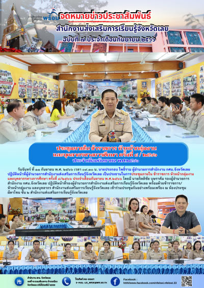 วันจันทร์ ที่ ๑๑ กันยายน พ.ศ. ๒๕๖๖ เวลา ๐๙.๓๐ น. นายประกอบ โพธิ์ราม ผู้อำนวยการสำนักงาน กศน.จังหวัดเลยปฏิบัติหน้าที่ผู้อำนวยการสำนักงานส่งเสริมการเรียนรู้จังหวัดเลย เป็นประธานในการประชุมภายใน ข้าราชการ หัวหน้ากลุ่มงานและบุคลากรทางการศึกษา ครั้งที่ ๘/๒๕๖๖ ประจำเดือนกันยายน พ.ศ.๒๕๖๖ โดยมี นายกิตติชัย บุษราคัม รองผู้อำนวยการสำนักงาน กศน.จังหวัดเลย ปฏิบัติหน้าที่รองผู้อำนวยการสำนักงานส่งเสริมการเรียนรู้จังหวัดเลย พร้อมด้วยข้าราชการ/หัวหน้ากลุ่มงาน และบุคลากร สำนักงานส่งเสริมการเรียนรู้จังหวัดเลย เข้าร่วมประชุมกันอย่างพร้อมเพรียง ณ ห้องประชุมผีตาโขน ชั้น ๒ สำนักงานส่งเสริมการเรียนรู้จังหวัดเลย