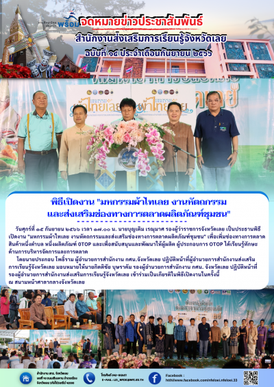 วันศุกร์ที่ ๑๕ กันยายน ๒๕๖๖ เวลา ๑๗.๐๐ น. นายบุญเติม เรณุมาศ รองผู้ว่าราชการจังหวัดเลย เป็นประธานพิธีเปิดงาน "มหกรรมผ้าไทเลย งานหัตถกรรมและส่งเสริมช่องทางการตลาดผลิตภัณฑ์ชุมชน" เพื่อเพิ่มช่องทางการตลาดสินค้าหนึ่งตำบล หนึ่งผลิตภัณฑ์ 0TOP และเพื่อสนับสนุนและพัฒนาให้ผู้ผลิต ผู้ประกอบการ OTOP ได้เรียนรู้ทักษะด้านการบริหารจัดการและการตลาด
