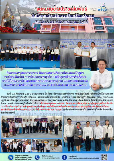 วันที่ ๑๙ กันยายน ๒๕๖๖ นายประกอบ โพธิ์ราม ผู้อำนวยการสำนักงาน กศน.จังหวัดเลย ปฏิบัติหน้าที่ผู้อำนวยการสำนักงานส่งเสริมการเรียนรู้จังหวัดเลย มอบหมายให้นายกิตติชัย บุษราคัม รองผู้อำนวยการสำนักงาน กศน. จังหวัดเลย ปฏิบัติหน้าที่รองผู้อำนวยการสำนักงานส่งเสริมการเรียนรู้จังหวัดเลย พร้อมด้วยนางสายันต์ คิดเข่ม ศึกษานิเทศก์ชำนาญการ พิเศษ และข้าราชการครูในสังกัด เข้าร่วมกิจกรรมสรุปผลการตรวจ ติดตามสถานศึกษาต้นแบบหลักสูตรรายวิชาเพิ่มเติม "การป้องกันการทุจริต " หลักสูตรต้านทุจริตศึกษา ภายใต้โครงการป้องกันและปราบปรามการทุจริต และประพฤติมิชอบของสำนักงานศึกษาธิการภาค ๑๐ ประจำปีงบประมาณ พ.ศ. ๒๕๖๖ ณ ห้องประชุมลาวแพน โรงแรมเจริญโฮเต็ล อำเภอเมือง จังหวัดอุดรธานี