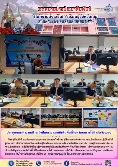 วันพฤหัสบดี ที่ ๒๑ กันยายน ๒๕๖๖ นายประกอบ โพธิ์ราม ผู้อำนวยการสำนักงาน กศน.จังหวัดเลย ปฏิบัติหน้าที่ผู้อำนวยการสำนักงานส่งเสริมการเรียนรู้จังหวัดเลย มอบหมายให้นายกิตติชัย บุษราคัม รองผู้อำนวยการสำนักงาน กศน.จังหวัดเลย ปฏิบัติหน้าที่รองผู้อำนวยการสำนักงานส่งเสริมการเรียนรู้จังหวัดเลย เข้าร่วมประชุมคณะทำงานเฝ้าระวังปัญหายาเสพติดในพื้นที่จังหวัดเลย ครั้งที่ ๑๒/๒๕๖๖ เพื่อให้การติดตามสถานการณ์ปัญหายาเสพติดของจังหวัดเลย เป็นไปตามวัตถุประสงค์ที่กำหนด