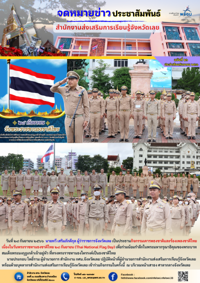 วันที่ ๒๘ กันยายน ๒๕๖๖ นายทวี เสริมภักดีกุล ผู้ว่าราชการจังหวัดเลย เป็นประธานกิจกรรมเคารพธงชาติและร้องเพลงชาติไทย เนื่องในวันพระราชทานธงชาติไทย ๒๘ กันยายน (Thai National Flag Day) เพื่อร่วมน้อมรำลึกในพระมหากรุณาธิคุณของพระบาทสมเด็จพระมงกุฏเกล้าเจ้าอยู่หัว ที่ทรงพระราชทานธงไตรรงค์เป็นธงชาติไทย
